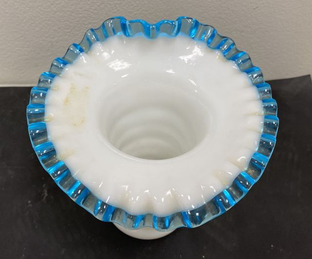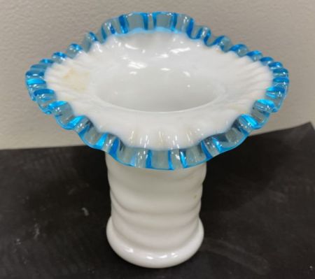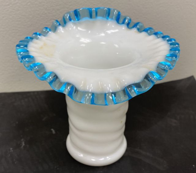 Fenton White Pulpit Vase, blue crimped/ruffled rimmed, good condition, 5"h. Fenton White Pulpit Vase, blue crimped/ruffled rimmed, good condition, 5"h.