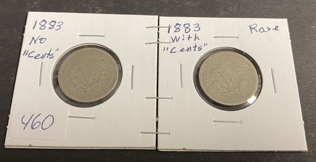 1893 Liberty "V" Nickels, one "no cents", one with "Cents", Rare. paper case. 1893 Liberty "V" Nickels, one "no cents", one with "Cents", Rare. paper case.