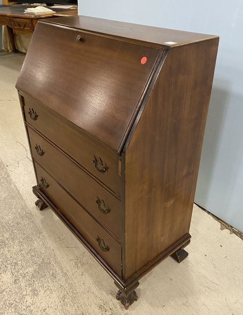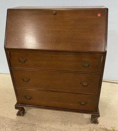 Ball-n-Claw Mahogany Secretary, drop front writing desk, organizer inner shelf, three drawers, has finish wear mostly on base feet, 38"h., 30"w., 15"d. Ball-n-Claw Mahogany Secretary, drop front writing desk, organizer inner shelf, three drawers, has finish wear mostly on base feet, 38"h., 30"w., 15"d.