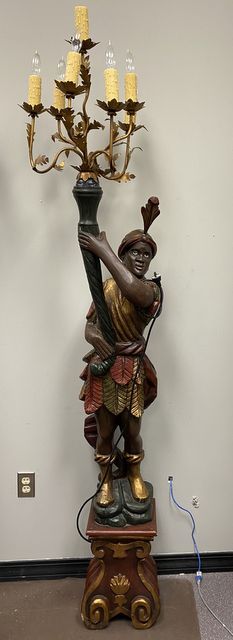 Blackamoor Wood Carved Candelabra Floor Lamp, Candelabra Light Fixture, hand painted, wood carved, has some loose sections, 87"h. Blackamoor Wood Carved Candelabra Floor Lamp, Candelabra Light Fixture, hand painted, wood carved, has some loose sections, 87"h.