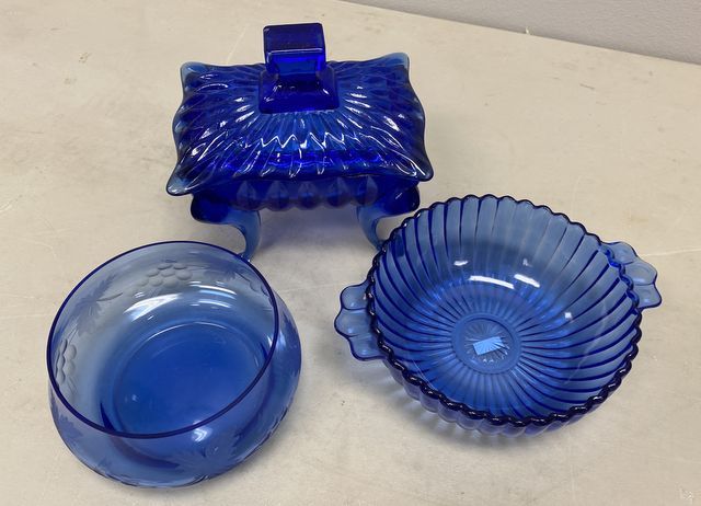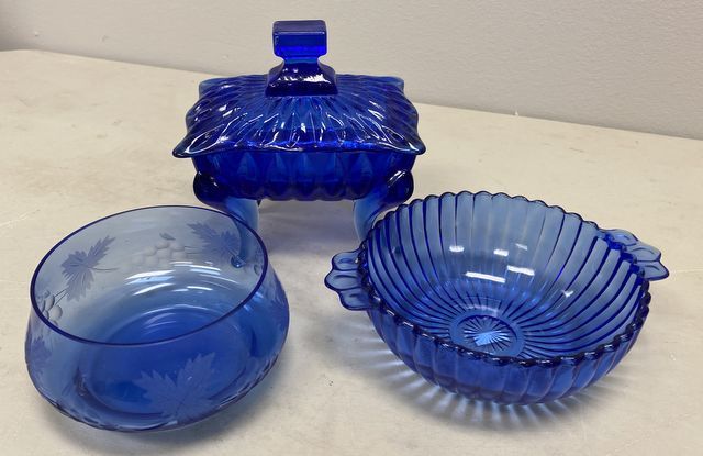 515 Blue Glass Bowls and Covered Candy Dish