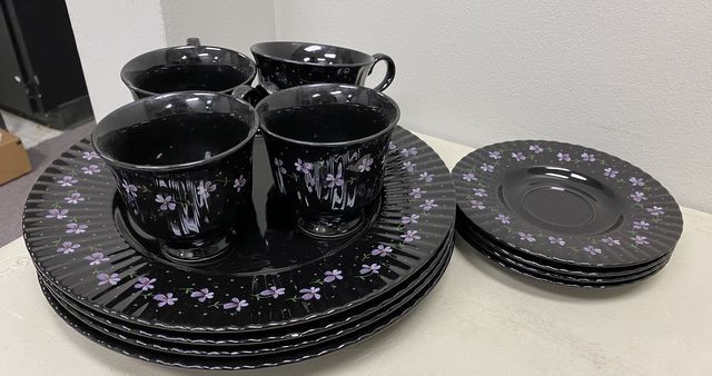 Mikasa Classic Elegance "Night Shade" Dinner Ware, four dinner plates, four mugs and saucers. Mikasa Classic Elegance "Night Shade" Dinner Ware, four dinner plates, four mugs and saucers.
