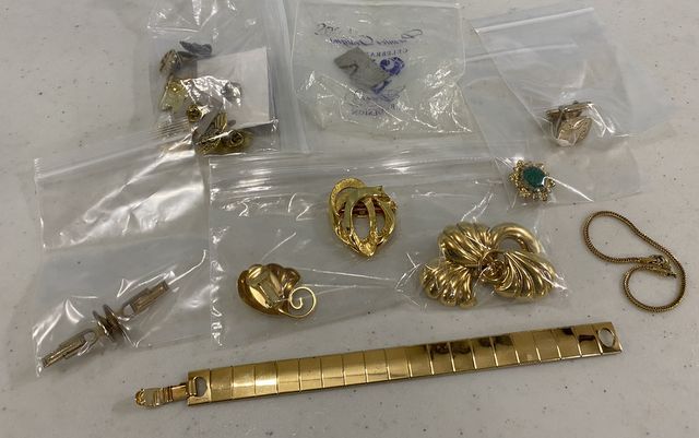 Costume jewelry pieces, gold color bracelet, clip on earrings, bracelet, cuff links, pins. Costume jewelry pieces, gold color bracelet, clip on earrings, bracelet, cuff links, pins.