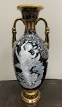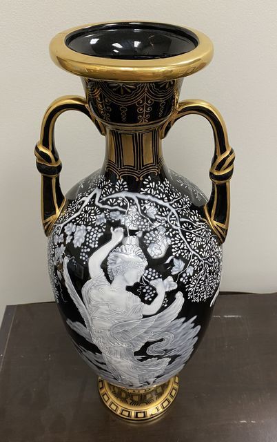 Porcelain M Marked Grecian Urn, black, white, and gold finish, good condition, 18"h. Porcelain M Marked Grecian Urn, black, white, and gold finish, good condition, 18"h.