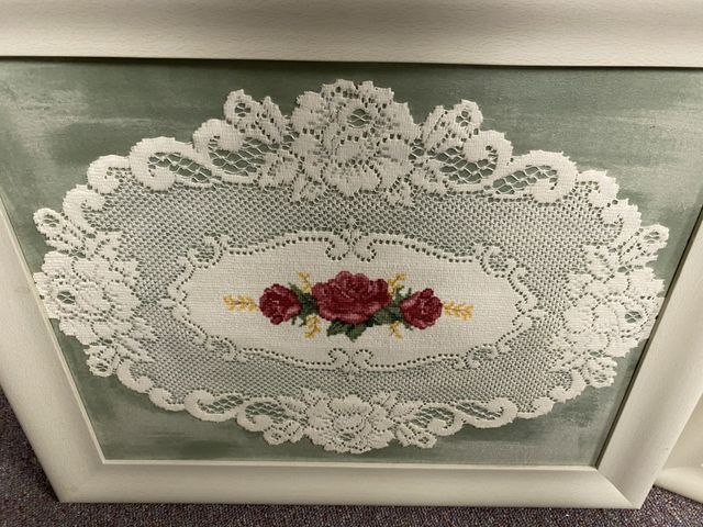 Pair of Resin Crochet Style Prints, plastic crochets, framed, 20"h., 25"w. Pair of Resin Crochet Style Prints, plastic crochets, framed, 20"h., 25"w.