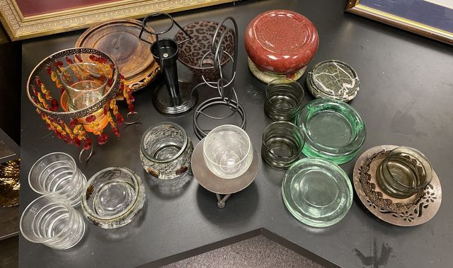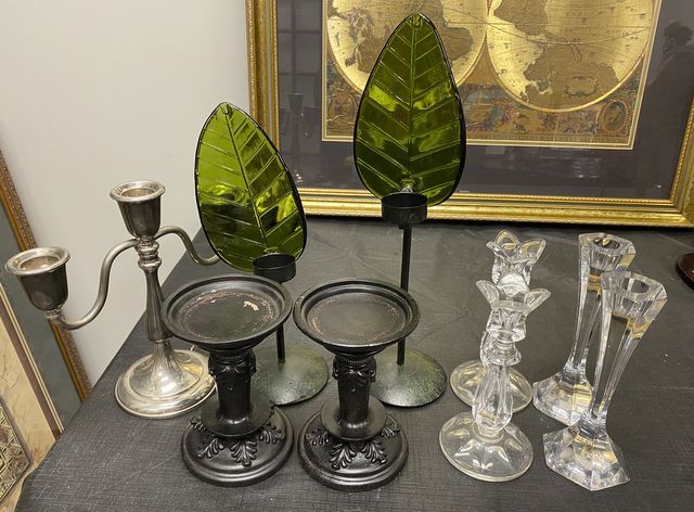 Pair of Candle stands with leaf backs, pair of black candle stands, four clear glass candle sticks, silver plate candelabra. Pair of Candle stands with leaf backs, pair of black candle stands, four clear glass candle sticks, silver plate candelabra.