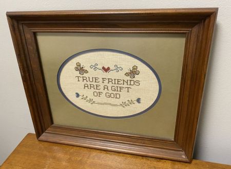 True Friends are a Gift of Gold Needle Point, oval matted, glassed, framed, 17"h., 14"w. True Friends are a Gift of Gold Needle Point, oval matted, glassed, framed, 17"h., 14"w.