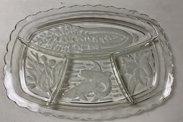 Clear Glass Divided Relish Platter, embossed fish and plants, 15 1/2"w. Clear Glass Divided Relish Platter, embossed fish and plants, 15 1/2"w.