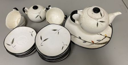 Oriental Black and White Tea Set, pitcher, dinner plate, 6 saucers, 6 dessert plates, sugar, four cups. Oriental Black and White Tea Set, pitcher, dinner plate, 6 saucers, 6 dessert plates, sugar, four cups.