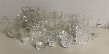 Collection of Clear Glass Pitcher, 12 total, assorted style, tallest is 5"h. Collection of Clear Glass Pitcher, 12 total, assorted style, tallest is 5"h.