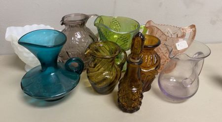 Milk glass pitcher, green glass pitcher, decanter, vase, and clear glass pitcher. Milk glass pitcher, green glass pitcher, decanter, vase, and clear glass pitcher.