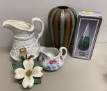 Decorative pottery pieces, ceramic flower, ceramic pitcher, metal vase, art glass. Decorative pottery pieces, ceramic flower, ceramic pitcher, metal vase, art glass.