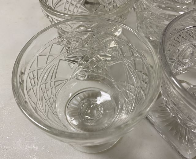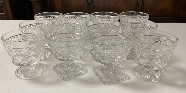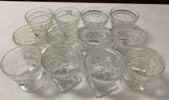 12 Depression Glass Cups, footed, pressed, 3 1/2"h. 12 Depression Glass Cups, footed, pressed, 3 1/2"h.