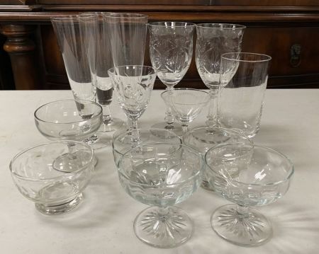 Group of glass stemware, goblets, sherbets, bowl, champagne glasses. Group of glass stemware, goblets, sherbets, bowl, champagne glasses.