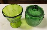 Vintage Amber Compote and Depression Green Glass Cookie Jar, 5"h Vintage Amber Compote and Depression Green Glass Cookie Jar, 5"h