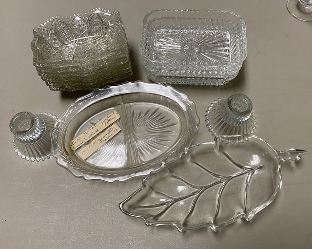 733 Glass Leaf Dish, Sunburst Dish, Pair of Candle Holders, and Dishes