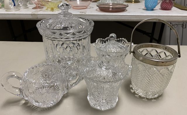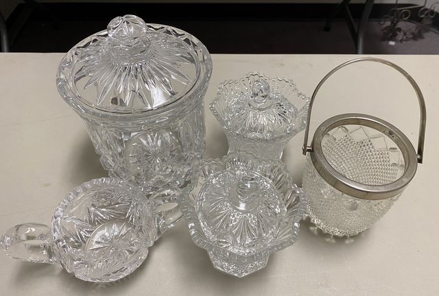 Pressed Glass jar with handled, double handled cup, and containers. Pressed Glass jar with handled, double handled cup, and containers.