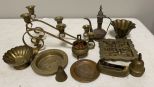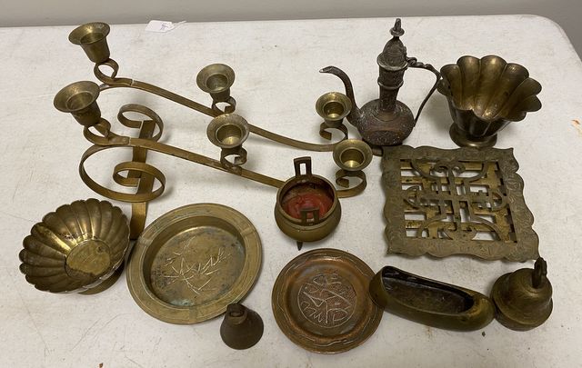 Collection of brass decor, candle holders, bowls, India pitcher, trivet, vase. Collection of brass decor, candle holders, bowls, India pitcher, trivet, vase.