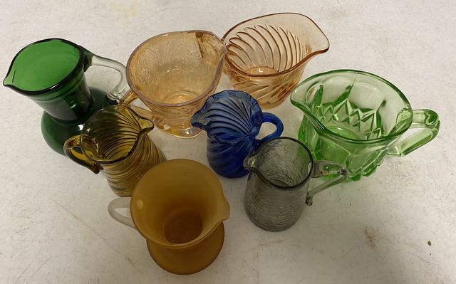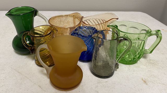 Eight Art Glass small pitcher, assorted styles and sized, tallest is 4"h. Eight Art Glass small pitcher, assorted styles and sized, tallest is 4"h.