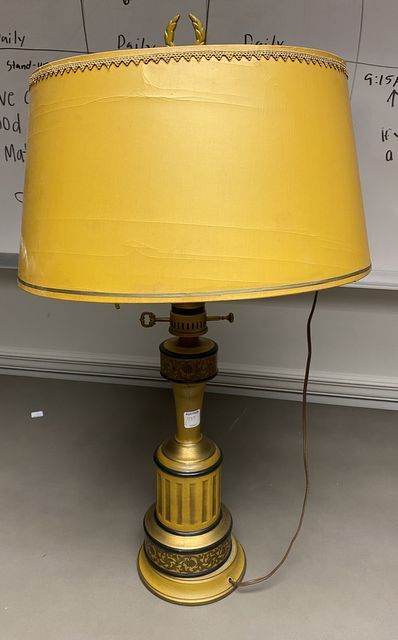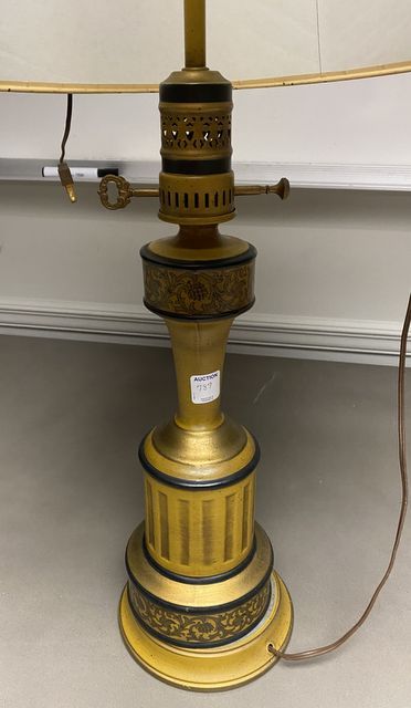 Mid Century Column Style Lamp, metal frame, shade has slight tilt, 30"h. Mid Century Column Style Lamp, metal frame, shade has slight tilt, 30"h.