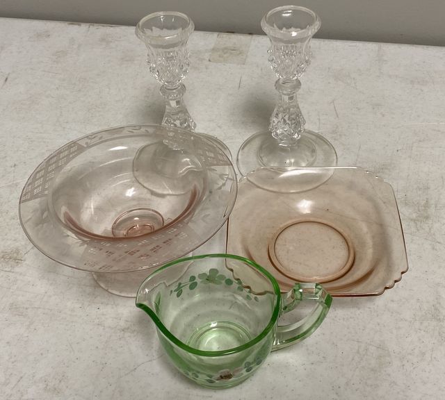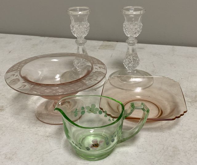 791 Pair of Glass Candle Holders, Compote, Creamer, and Bowl