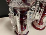 Pair of Red Bohemian Glass Lusters, large prims, no damage, etched floral, 13"h., 6 1/2"dia, Location Back Office Pair of Red Bohemian Glass Lusters, large prims, no damage, etched floral, 13"h., 6 1/2"dia, Location Back Office
