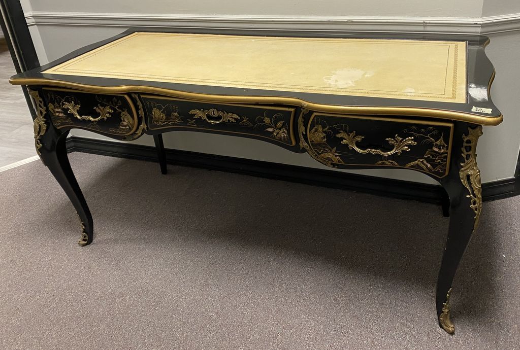 Black Lacquer Chinese Chinoiserie Writing Desk, leather top, has some bad spots on top, brass ormolu, 30"h., 60"w., 27"w. Location Right Wall Black Lacquer Chinese Chinoiserie Writing Desk, leather top, has some bad spots on top, brass ormolu, 30"h., 60"w., 27"w. Location Right Wall