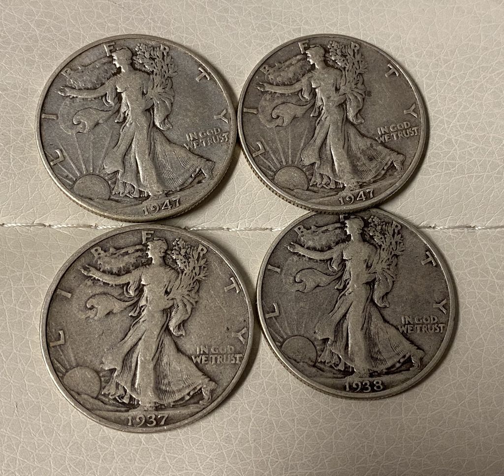 Four Silver Walking Liberty Half Dollars,1947, 1947 D, 1938, 1937 S, good condition. Location Case by Office Four Silver Walking Liberty Half Dollars,1947, 1947 D, 1938, 1937 S, good condition. Location Case by Office