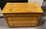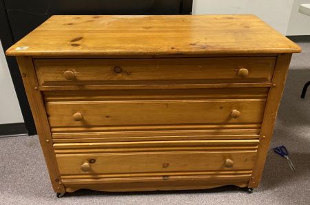 Pine chest of drawers, on wheels, three drawers, 31"h., 42"w., 20"d. Location Left Conference Room. Pine chest of drawers, on wheels, three drawers, 31"h., 42"w., 20"d. Location Left Conference Room.