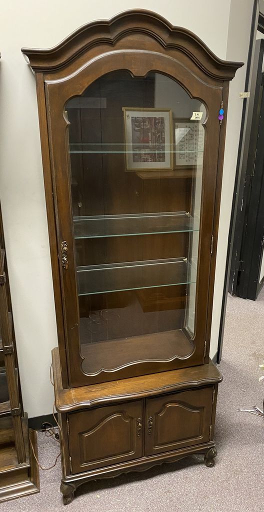 French Style Display Cabinet, Three glass shelves, single door with key, lighted, two door base, light wear, 76"h., 26"w., 16"d. Location Back French Style Display Cabinet, Three glass shelves, single door with key, lighted, two door base, light wear, 76"h., 26"w., 16"d. Location Back
