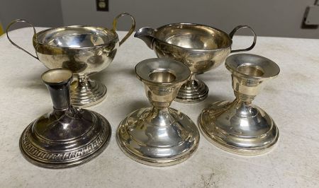 299 Five Weighted Sterling Creamer, Sugar, and Candle Holders