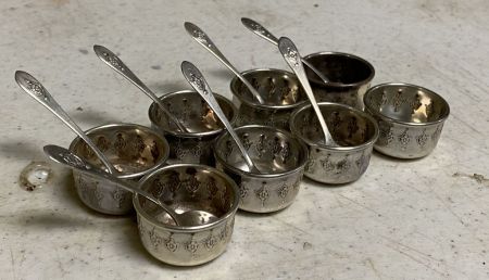 8 Sterling Salts, with 7 salt spoons, Location Room by Kitchen. 8 Sterling Salts, with 7 salt spoons, Location Room by Kitchen.
