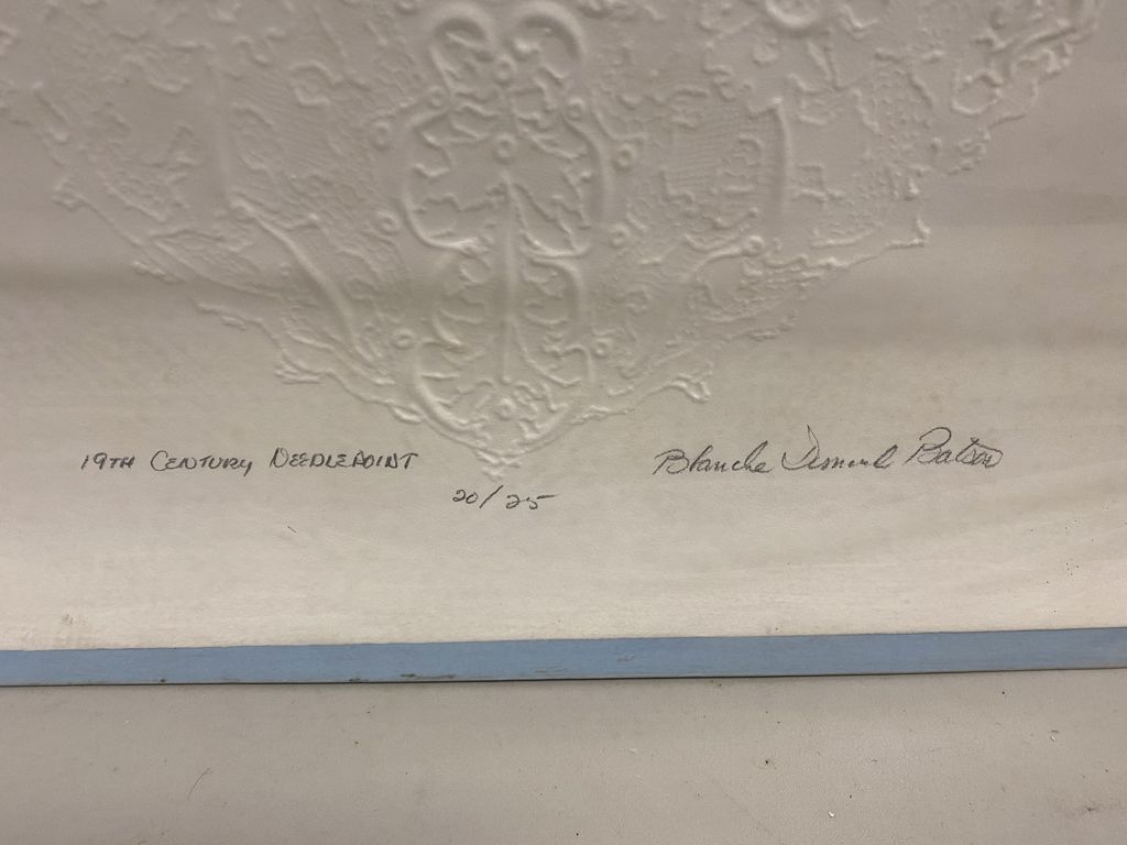 Blanche Batson "19th Century Needlepoint" Embossing, 20/25, unframed, Jackson Artist, 27"h.,24"w. Location Back Office Blanche Batson "19th Century Needlepoint" Embossing, 20/25, unframed, Jackson Artist, 27"h.,24"w. Location Back Office