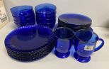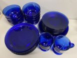 Collection of blue glassware, plates, bowls, and cups. Location Back Left Office Collection of blue glassware, plates, bowls, and cups. Location Back Left Office