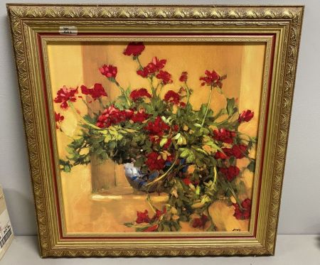 Signed Flower Still Life Print, gold gilt framed, 32"h. 31"w. Location Back Left Office Signed Flower Still Life Print, gold gilt framed, 32"h. 31"w. Location Back Left Office