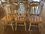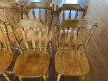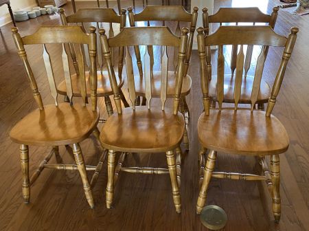 6 Farm Style Oak Dining Chairs, side chairs, spindle back, good condition. Location Left Office 6 Farm Style Oak Dining Chairs, side chairs, spindle back, good condition. Location Left Office