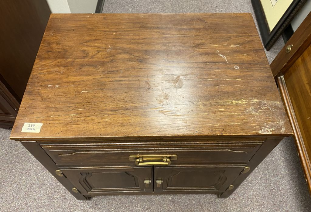 Davis Cabinet Co. Oak Night Stand, some worn spots, single drawer, two doors, 25"h., 26"w. Davis Cabinet Co. Oak Night Stand, some worn spots, single drawer, two doors, 25"h., 26"w.