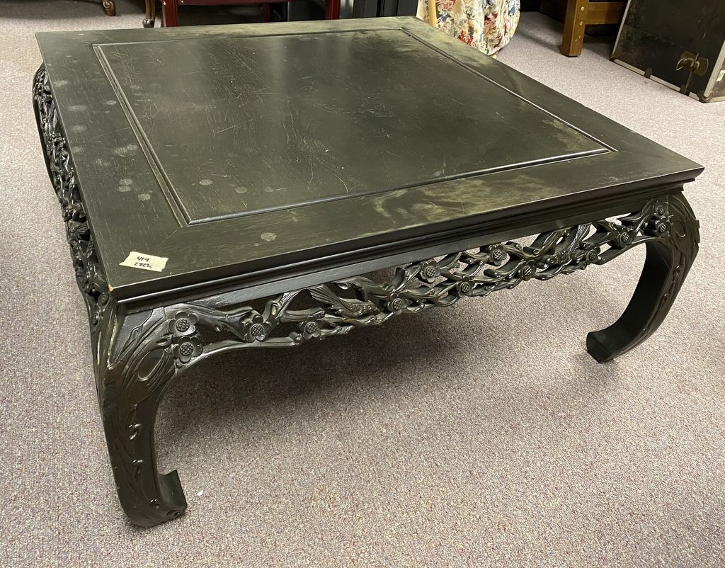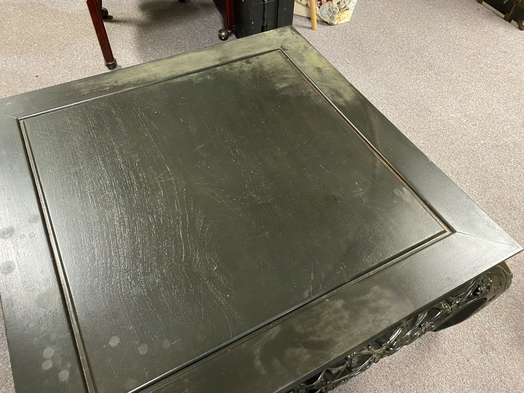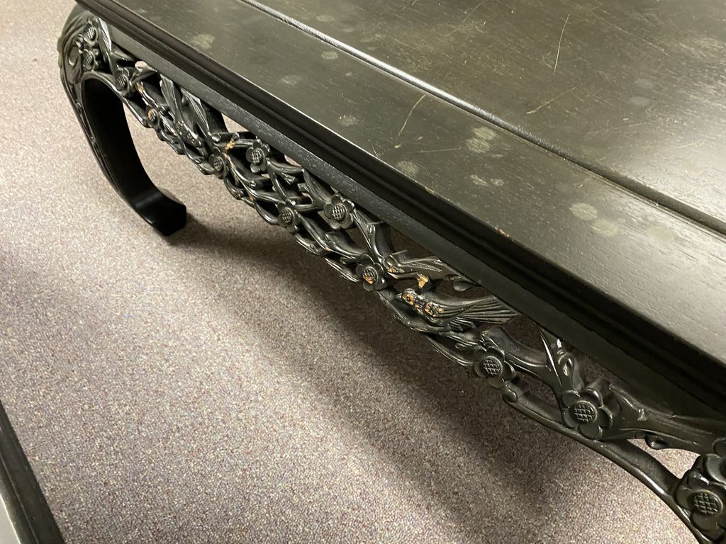 Asian Style Dark Finish Coffee Table, ornate carved, faded spots on top, 17"h., 36"w. Location Right Conference Room Asian Style Dark Finish Coffee Table, ornate carved, faded spots on top, 17"h., 36"w. Location Right Conference Room