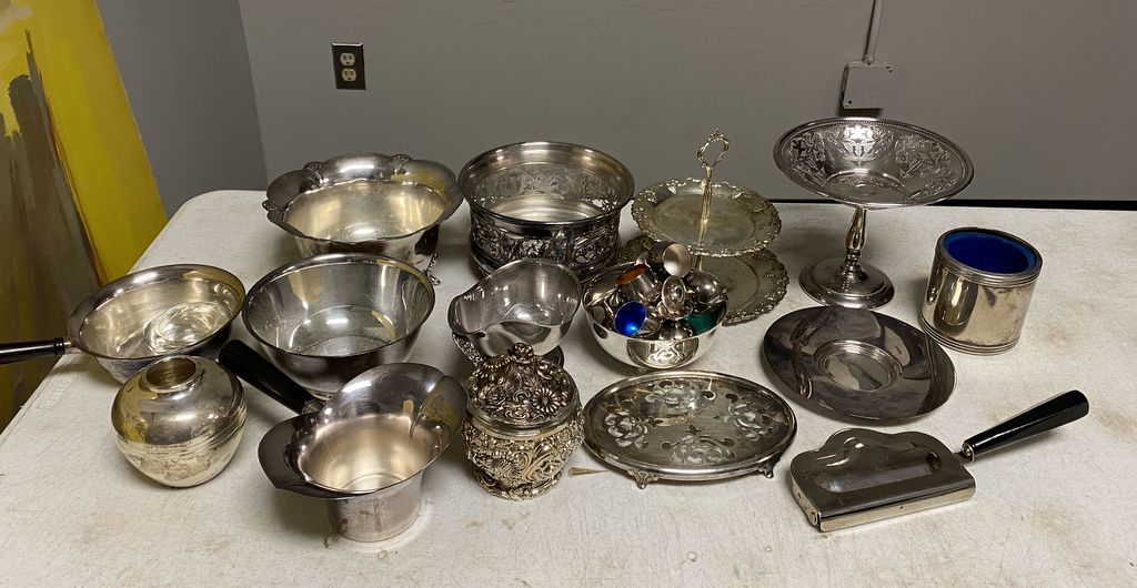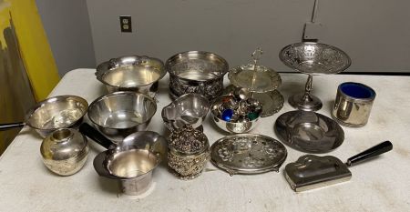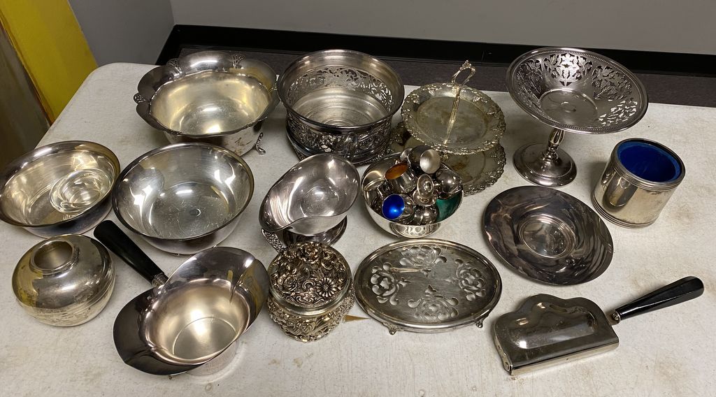 Group of Silver Plate Serving Pieces, bowls, compote, small goblets. Location Back Office Group of Silver Plate Serving Pieces, bowls, compote, small goblets. Location Back Office