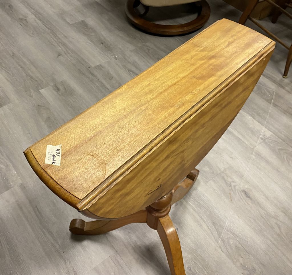 Small Maple Drop Leaf Pedestal Table, good condition, opens to round, 28"h., 24"dia. Location left Conference Room. Small Maple Drop Leaf Pedestal Table, good condition, opens to round, 28"h., 24"dia. Location left Conference Room.