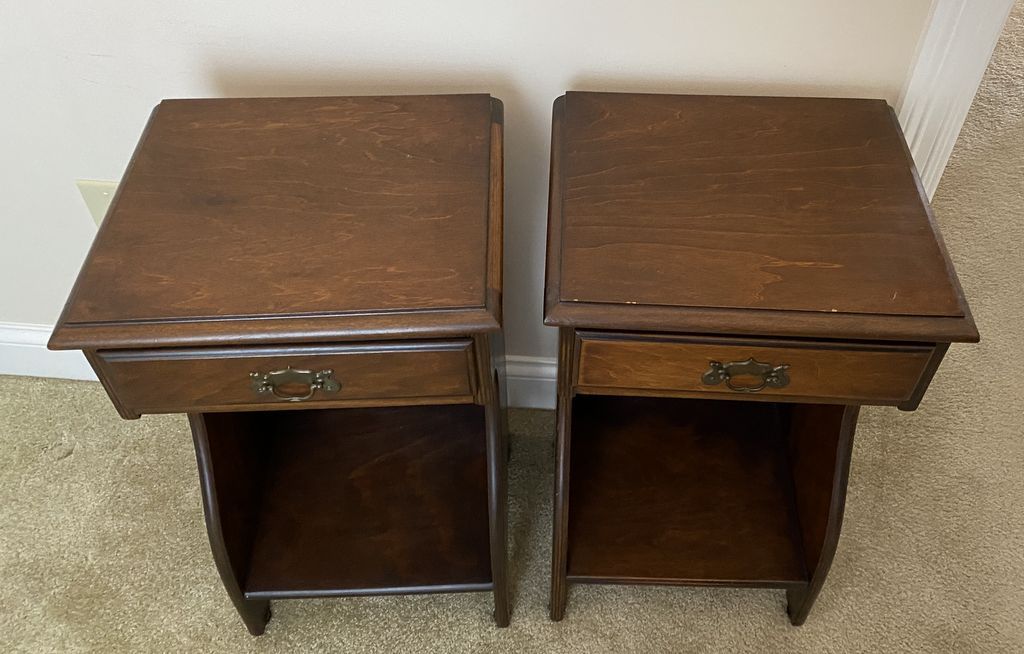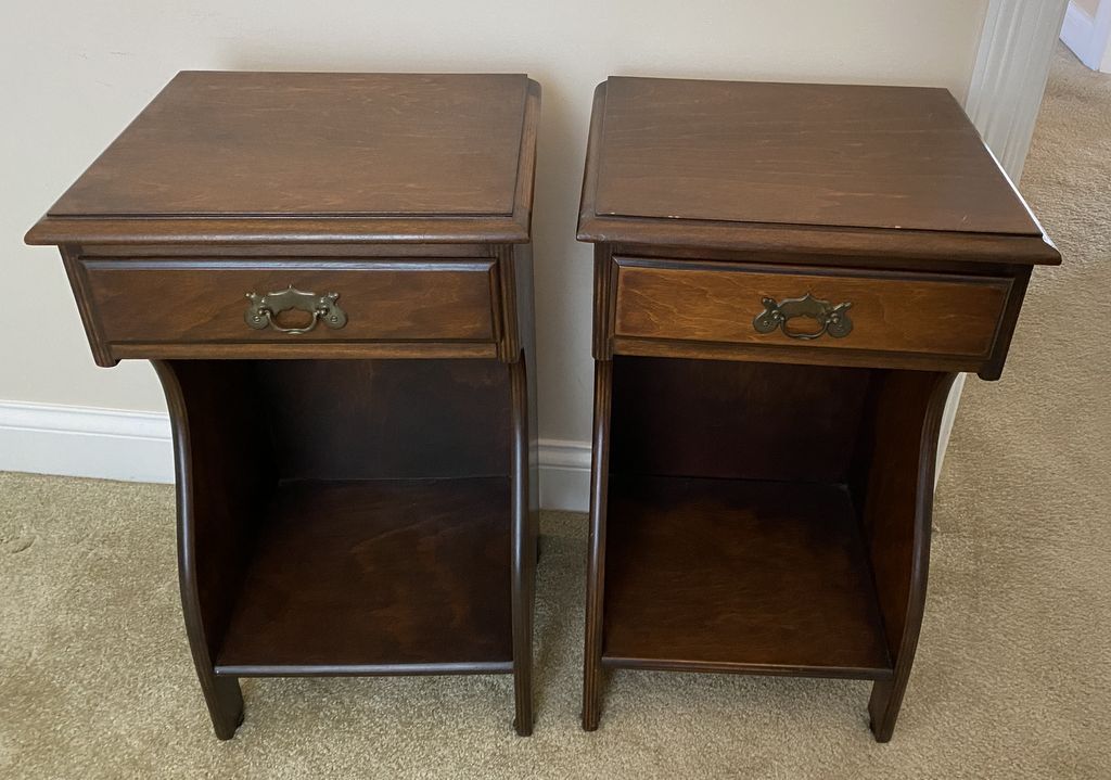 Pair of Mahogany Night Stands, single drawers, open front, light wear., 27"h., 15"w., Location Left Conference Pair of Mahogany Night Stands, single drawers, open front, light wear., 27"h., 15"w., Location Left Conference