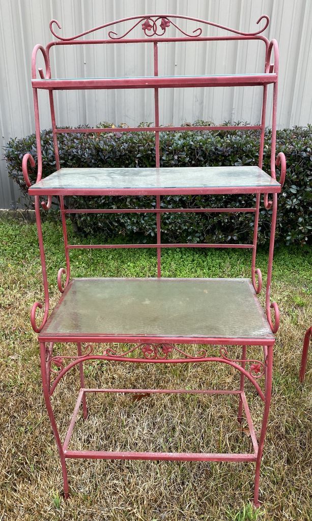 Red Metal outdoor planters rack, three shelf. Red Metal outdoor planters rack, three shelf.