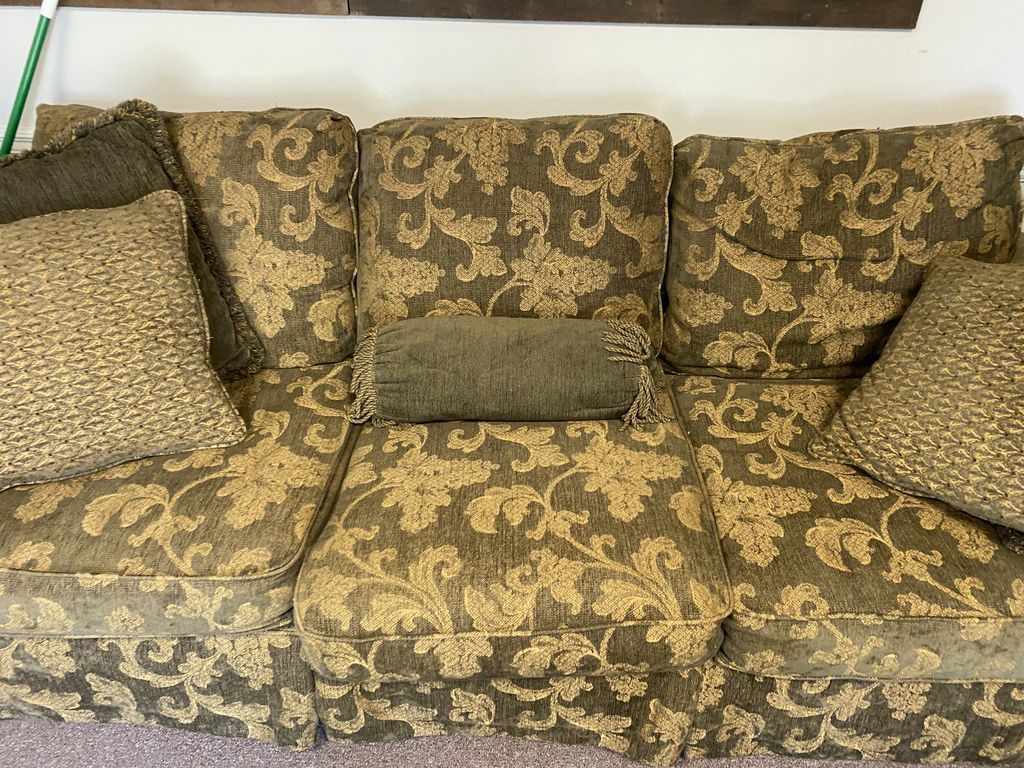 Floral Upholstered Three Cushion Sofa, Location Front, 7; Location in Main Kitchen Floral Upholstered Three Cushion Sofa, Location Front, 7; Location in Main Kitchen