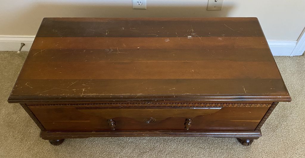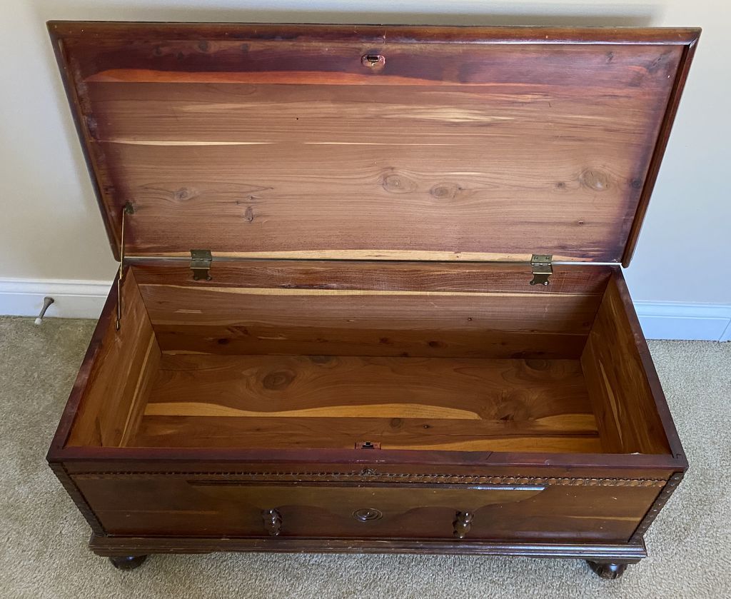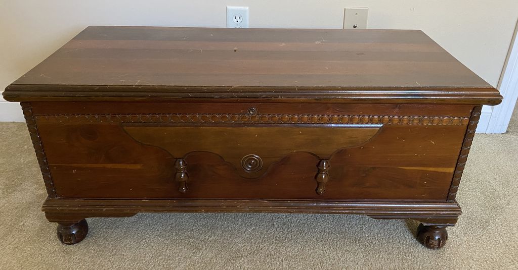 Depression Era Style Hope Chest, push button left top, with cedar lining, has scratches on finish, structure is good. 18"h., 39"w. Location Left Office Depression Era Style Hope Chest, push button left top, with cedar lining, has scratches on finish, structure is good. 18"h., 39"w. Location Left Office