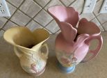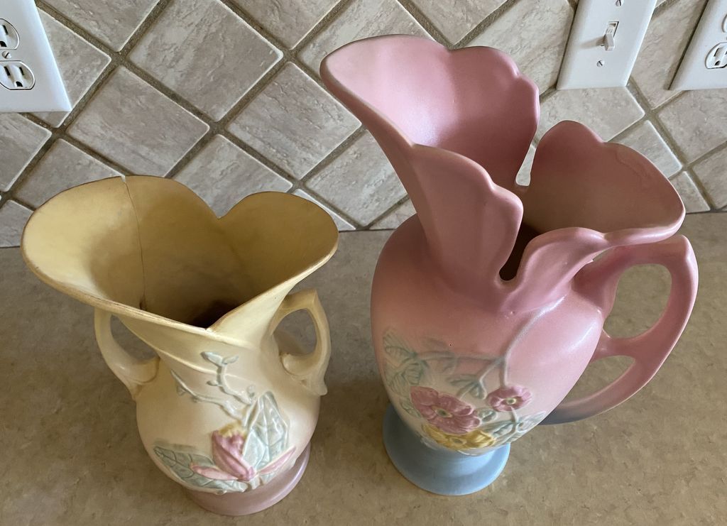 Two Hull Pottery Ewers, one has crack, 15"h. Location Back Right Office Two Hull Pottery Ewers, one has crack, 15"h. Location Back Right Office