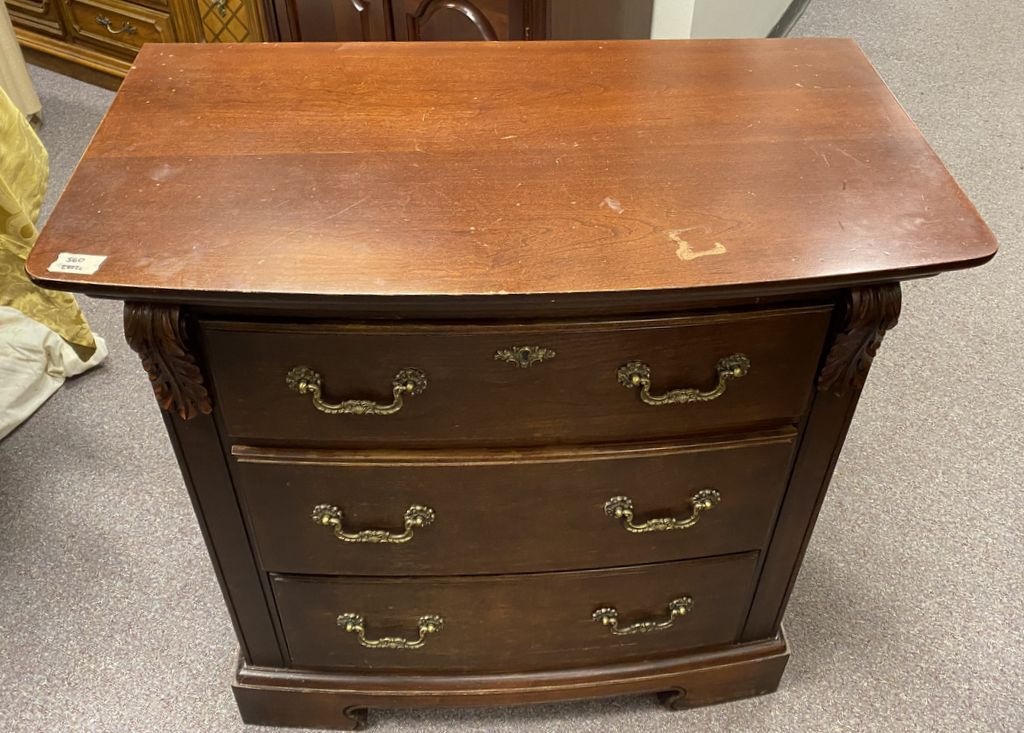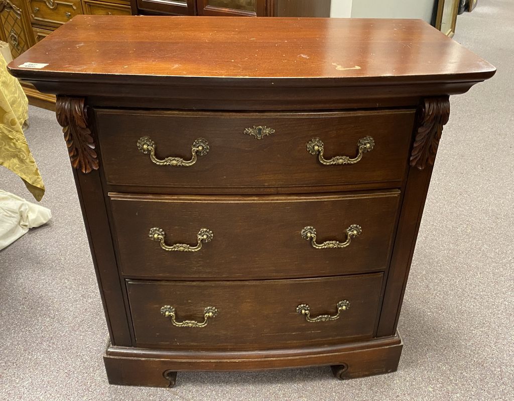 Thomasville Cherry Night Stand, three drawers, has bad spots on finish, 34"h., 34"w., 19"d. Thomasville Cherry Night Stand, three drawers, has bad spots on finish, 34"h., 34"w., 19"d.