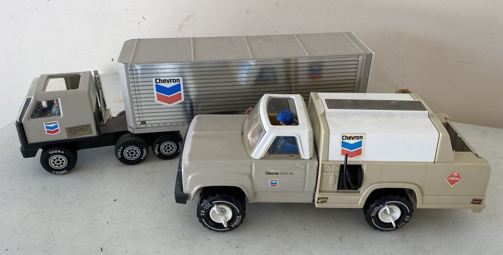 Vintage Chevron Toy Trucks, one plastic, one metal, Location Back Right Office Vintage Chevron Toy Trucks, one plastic, one metal, Location Back Right Office