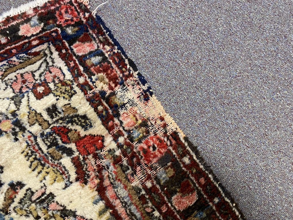Vintage Persian Wool Rug 2'7 x 4'9, has damaged spots. Location Back Right Office Vintage Persian Wool Rug 2'7 x 4'9, has damaged spots. Location Back Right Office