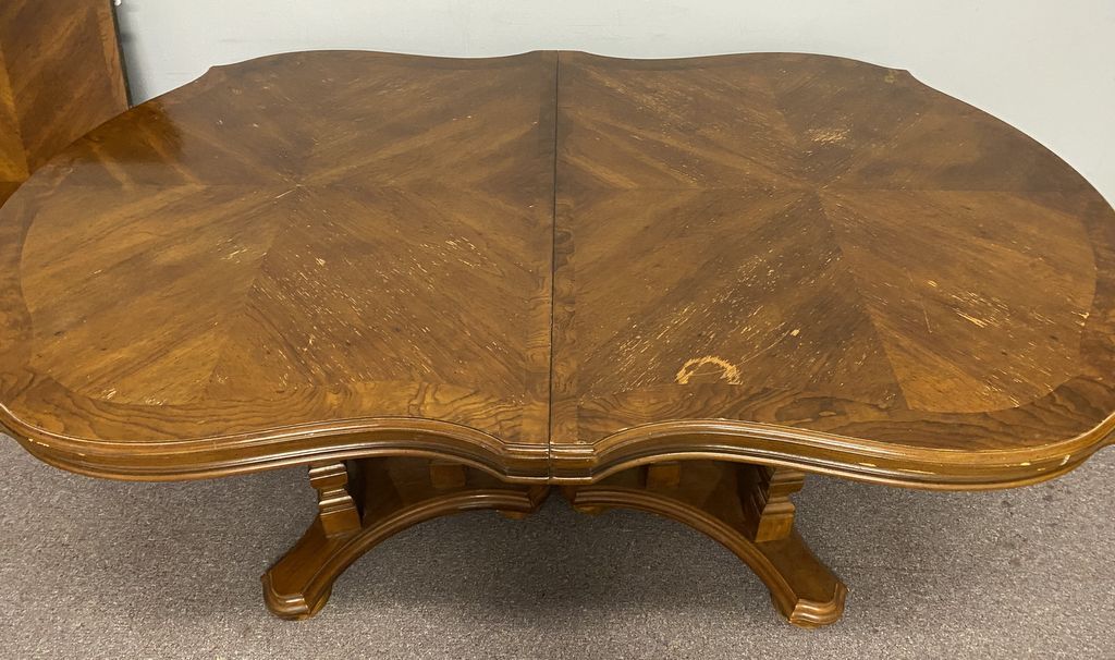 Late 20th Century Cherry Double Pedestal Dining Table, has one leaf, worn finish on top. Late 20th Century Cherry Double Pedestal Dining Table, has one leaf, worn finish on top.