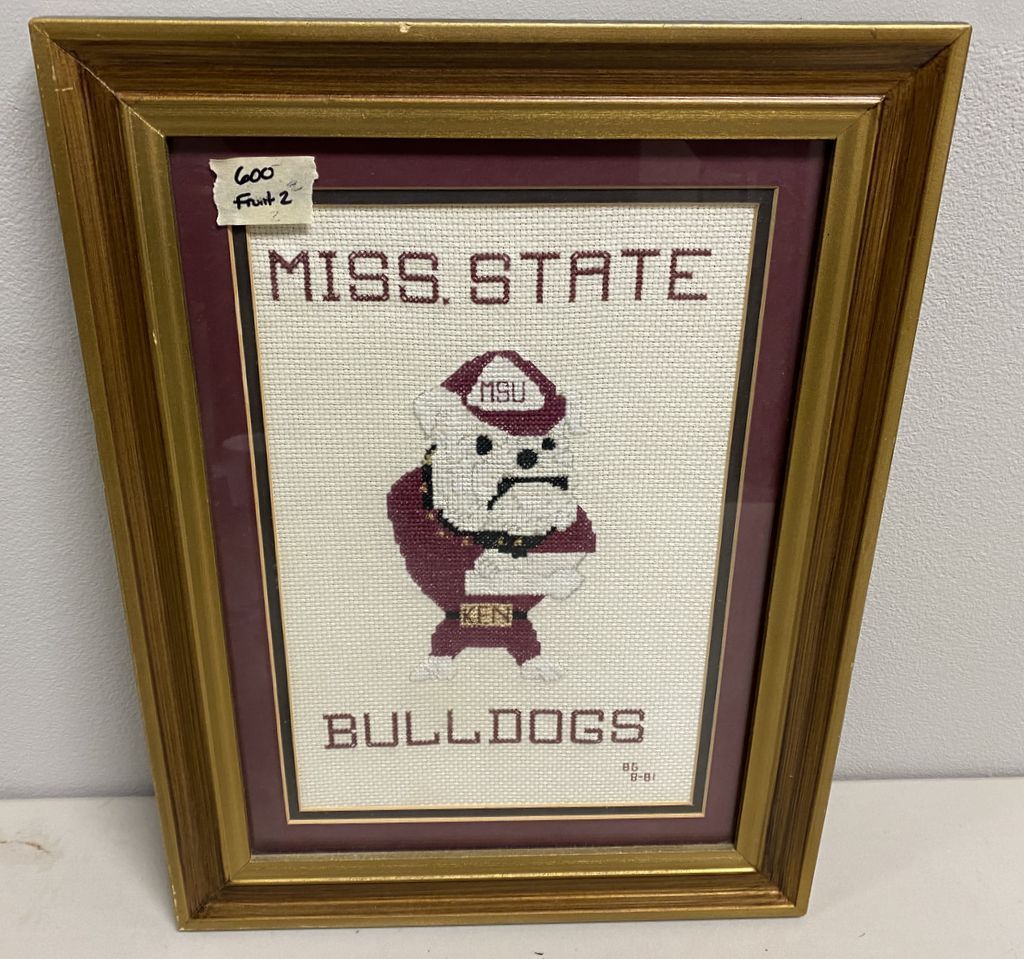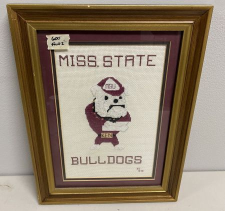 Miss. State Bulldogs Cross Stitch BG B-81, framed, 17"h., 12"w. Location Left Back Office. Miss. State Bulldogs Cross Stitch BG B-81, framed, 17"h., 12"w. Location Left Back Office.